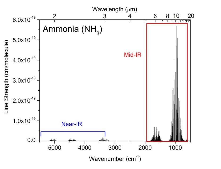 图1 NH3在近红外波段(蓝色框)比中红外波段(红色框)的吸收谱线弱近100倍