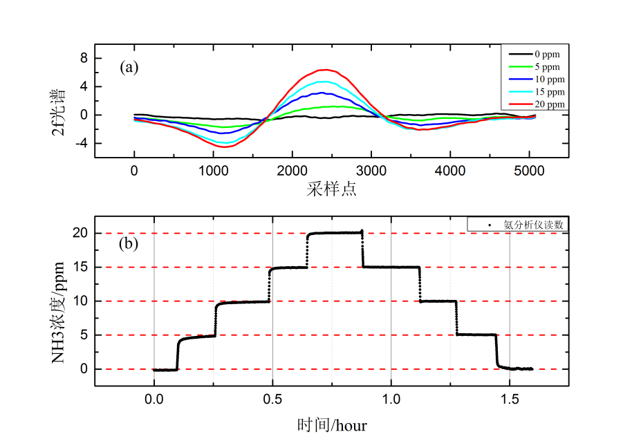 图7 浓度梯度测试(a)不同浓度的2f光谱(b)分析仪测量氨气浓度梯度