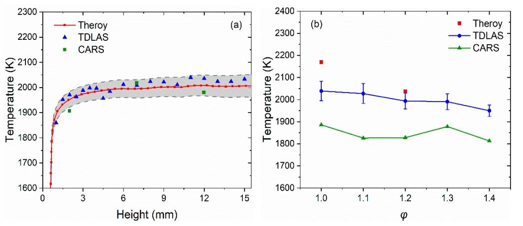 研究组首先使用了这个TDLAS系统测量不同当量比和不同火焰高度的平焰燃烧器温度。与CARS技术和理论计算所得结果相比,温度测量误差小于4%,温度变化趋势一致。